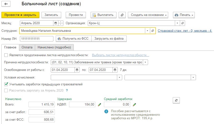 В новом документе внести информацию из бумажного больничного листа, а именно сведения об организации, сотруднике, номер документа, причину и период нахождения на больничном, стаж работы.