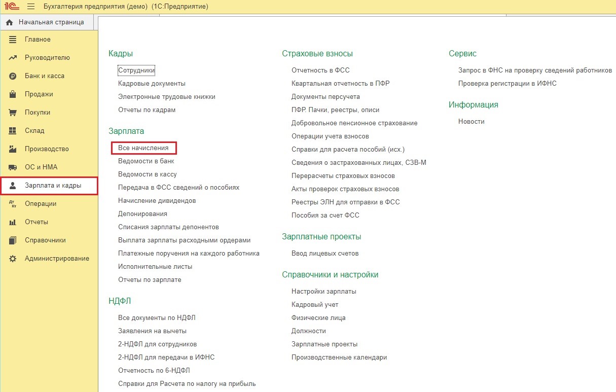 Для внесения информации по больничному листу в 1С: Бухгалтерия нужно во вкладке "Зарплата и кадры" зайти в раздел "Все начисления".