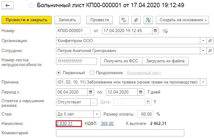 После этого нужно создать новый документ, ввести информацию из бумажного больничного листа, а именно сведения о сотруднике, номер документа, причину и период предоставления больничного.