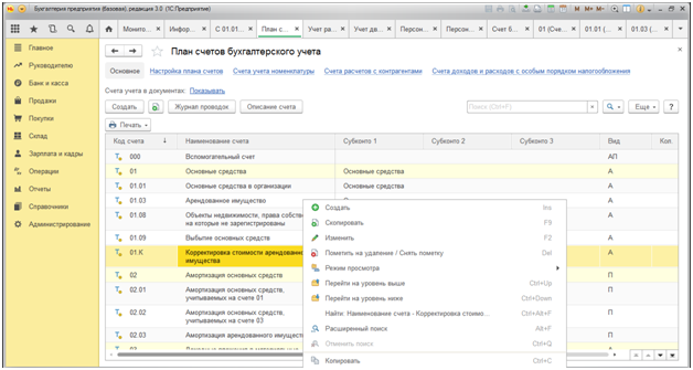 Чтобы добавить новый счет, нужно навести курсор на любое свободное пространство в данном окне. Далее необходимо кликнуть правой кнопкой мыши. Откроется специальная панель инструментов. Среди доступных опций пользователь выбирает «Создать», «Скопировать» или «Изменить». Вместо контекстного меню также можно использовать кнопку «Еще», расположенную над таблицей, в правой части экрана.