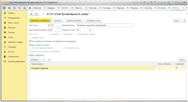 Аналитический учет позволяет выполнить детальный учет в разрезе лицевых счетов (материалов, работников и ОС). Это продолжение синтетического учета, дополненное натуральными и количественными показателями. Аналитика проводится при помощи субконто, привязанных к синтетическим счетам. Если счет является группировочным, то есть имеет субсчета, то при его создании или редактировании нужно поставить галочку «Счет является группой и не участвует в проводках».