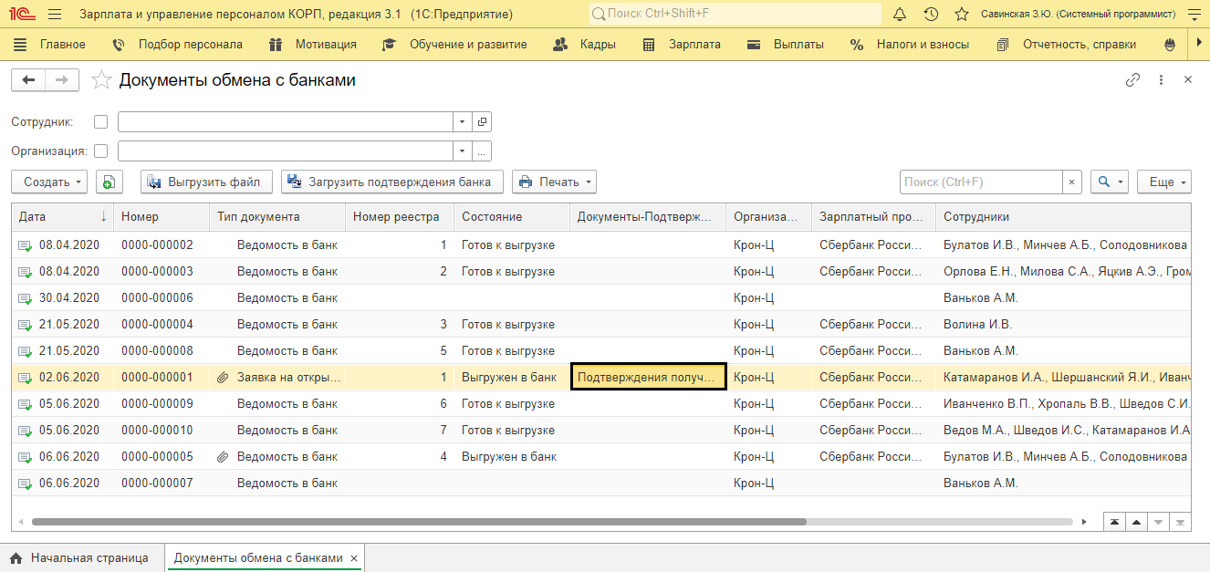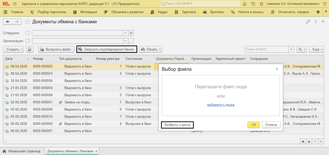 Как только файл-подтверждение от банка будет получен, его необходимо загрузить в систему (с использованием журнала документов обмена с банками).