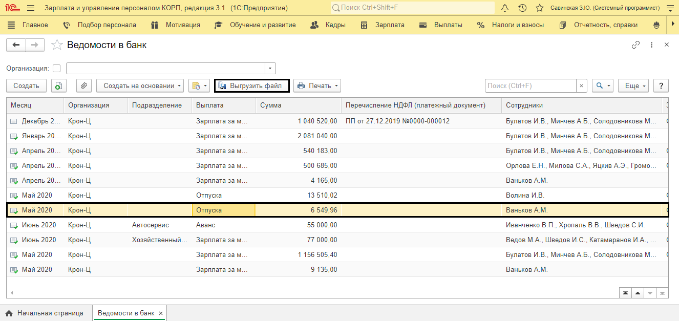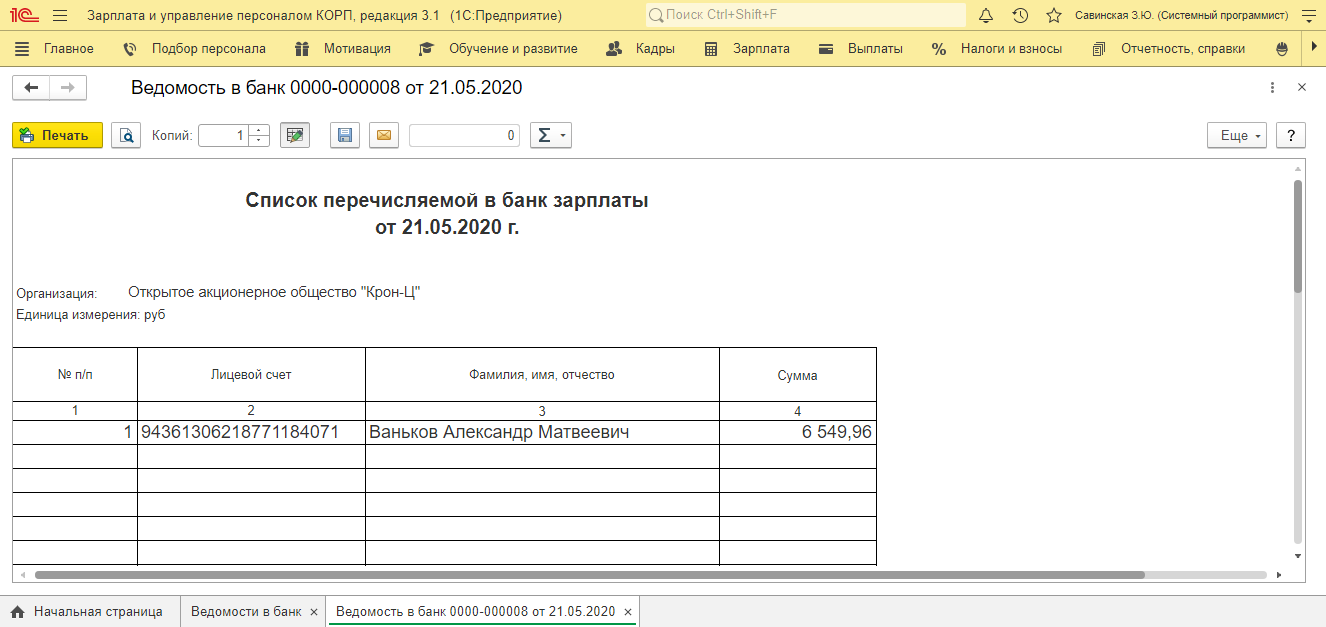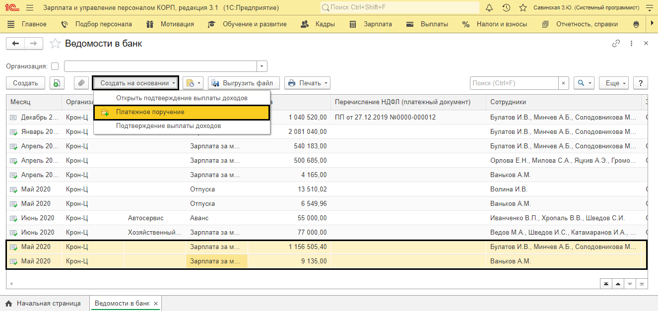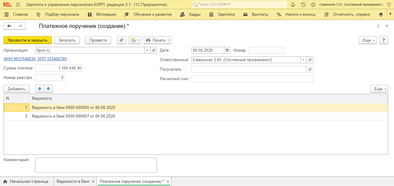 С учетом всех выделенных ведомостей и будет сформирована платежка на зарплату. Далее следует провести документ.