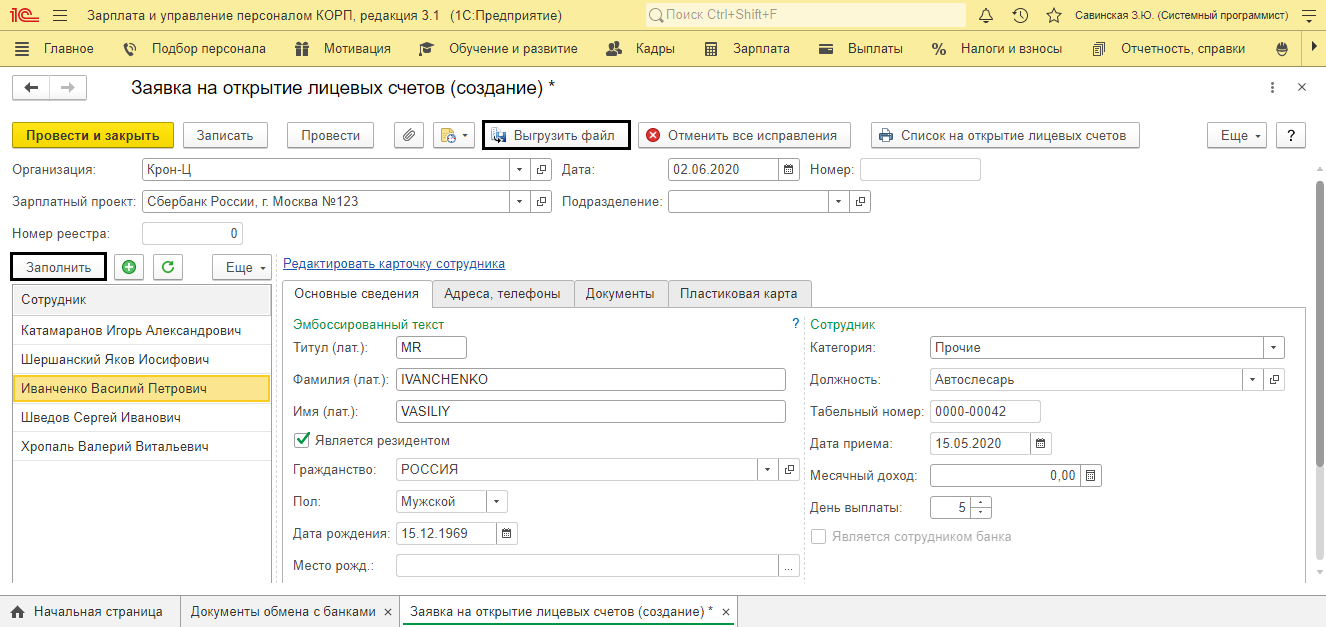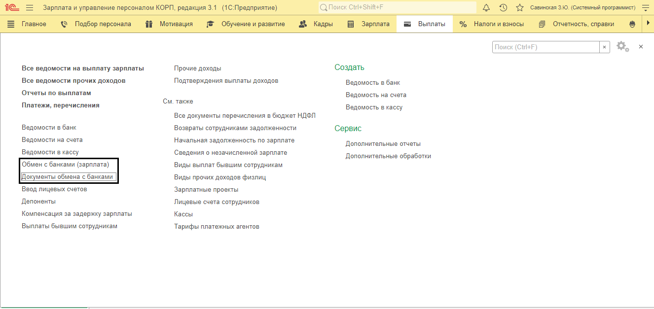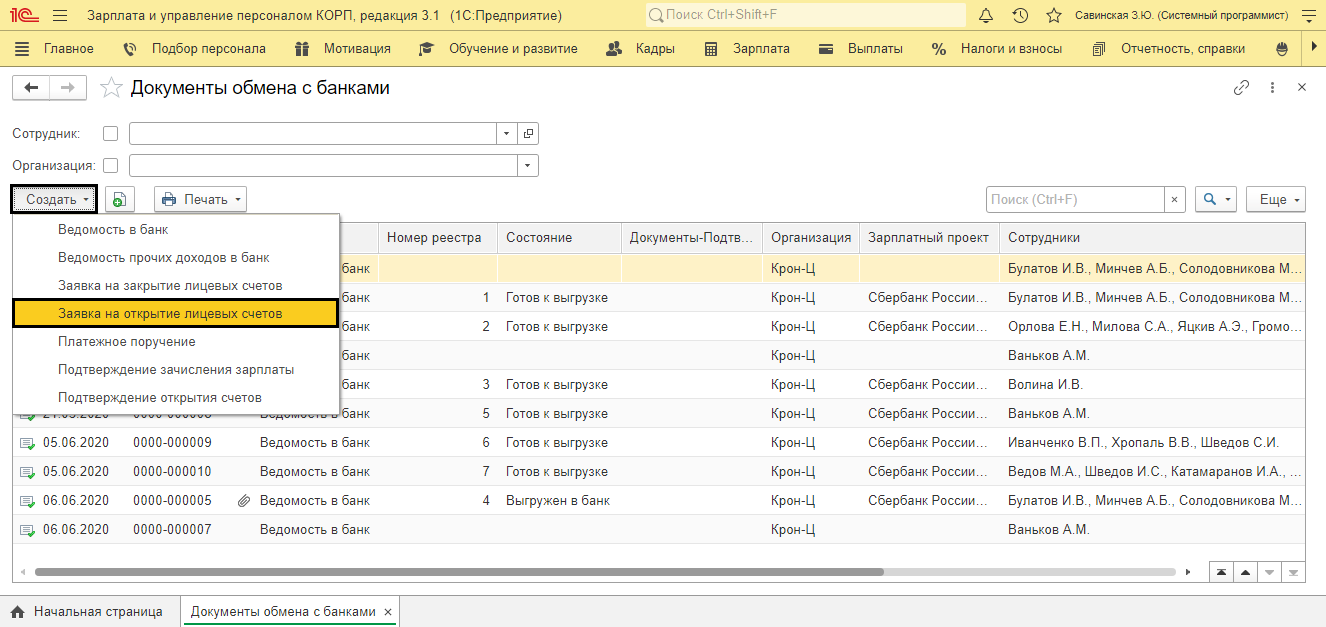 Если обмен успешно настроен, то для открытия ЛС банку следует направить соответствующую заявку. Ознакомиться с необходимыми документами можно в 1С:ЗУП (раздел «Выплаты-Документы обмена с банком»). После перехода в указанный раздел потребуется нажать «Создать», после чего останется выбрать подходящую заявку.