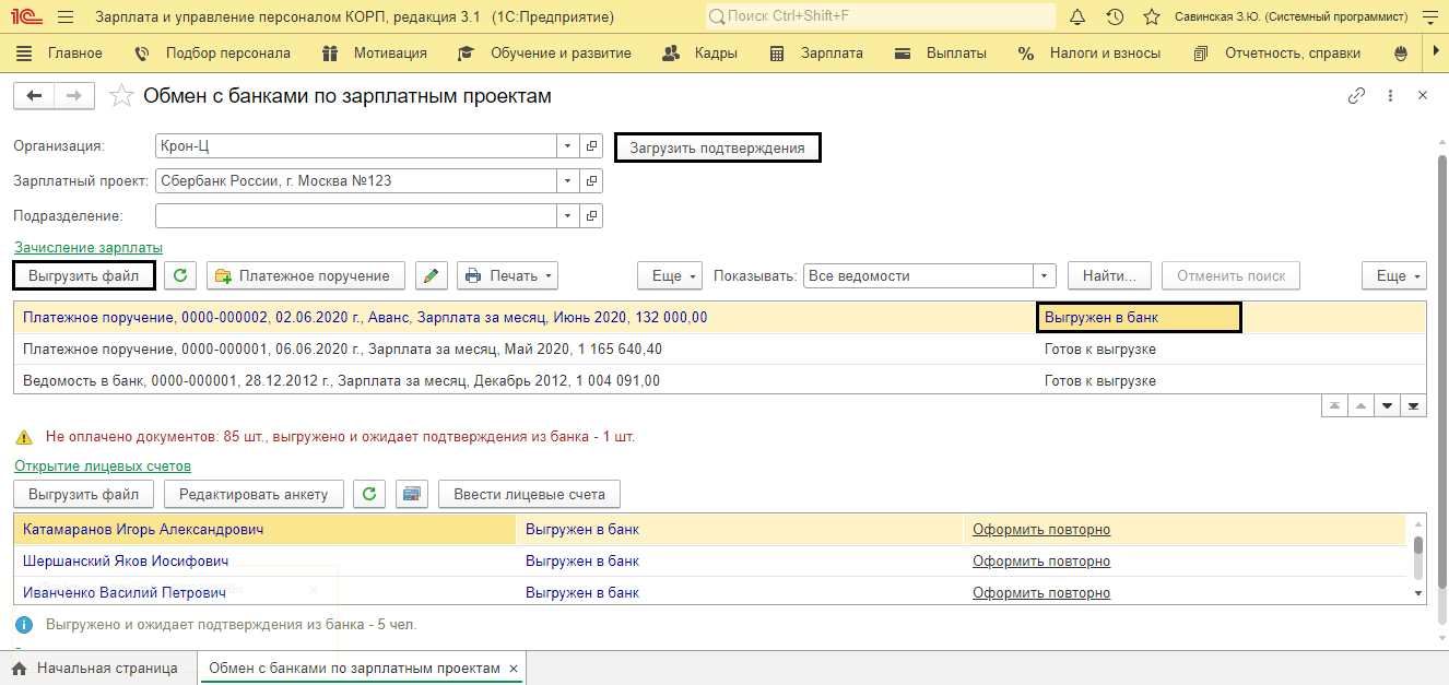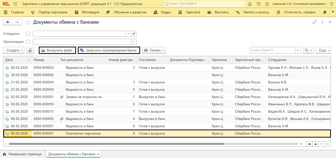 Формируем документы для дальнейшего обмена информацией с банком, для чего обращаемся к разделу «Обмен с банками по зарплатным проектам». В этом же разделе откроется доступ к группировке ведомостей (с их выделением) и созданию платежного поручения.