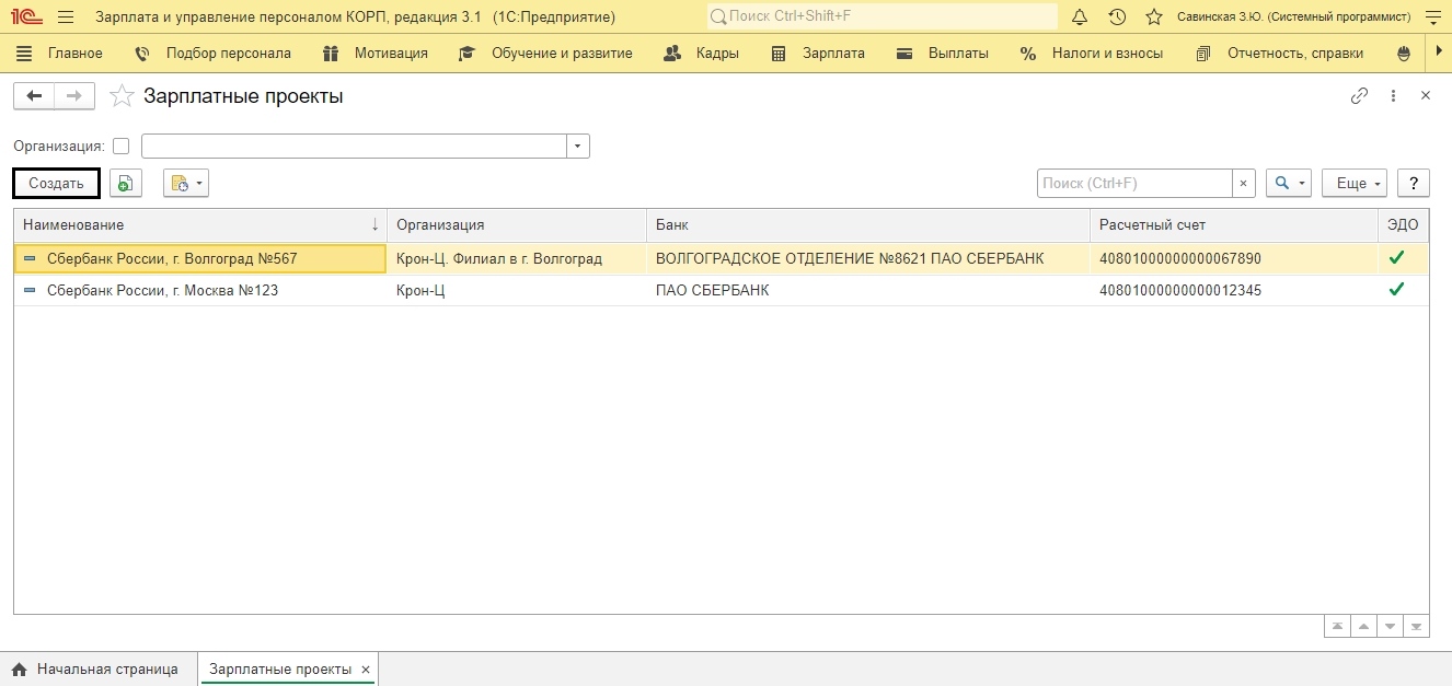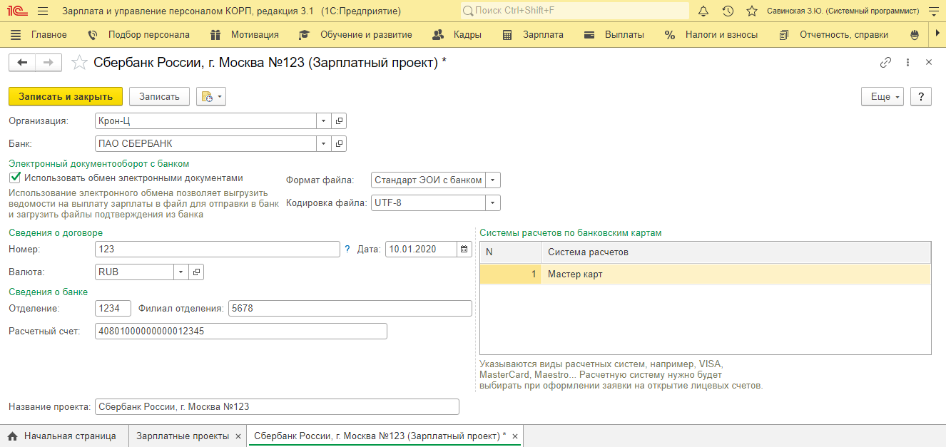 Компания может заключать договора сразу с несколькими банками, поэтому потребуется обязательно указать основной проект. Мы рекомендуем использовать комплексное внедрение 1С:ЗУП 3.1. При этом еще до старта системы будет обеспечена интеграция, как с решениями на платформе «1С:Предприятие», так и с задействованными банковскими системами.