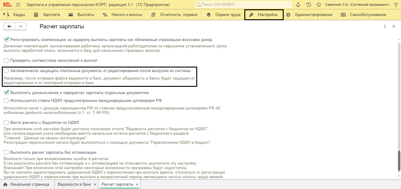 Чтобы документы не были испорчены случайным исправлением или же повторной отправкой, целесообразно обратиться к разделу «Настройка-Расчет зарплаты» и поставить там флаг. Благодаря данной настройке платежные документы не будут ошибочно отредактированы и не будут вновь направлены банку.