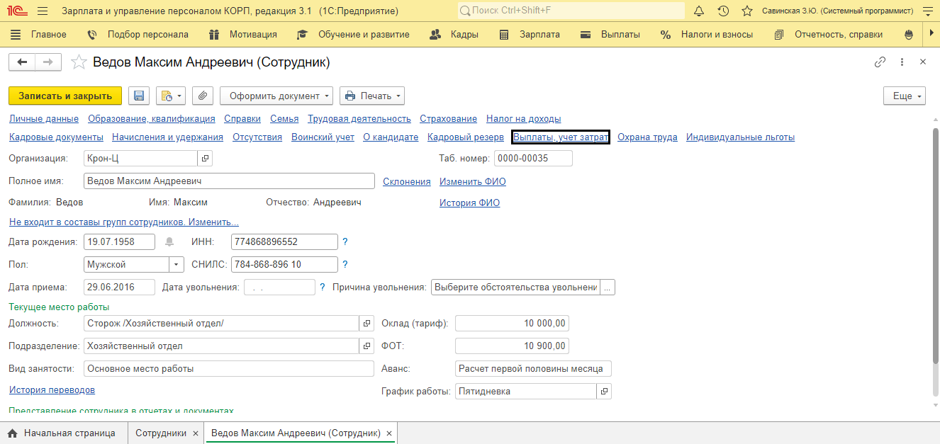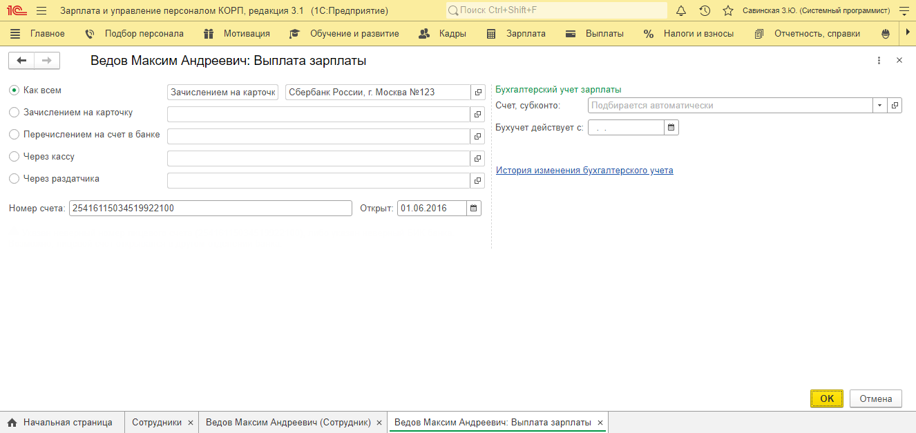 Тот же набор сведений будет отображаться и в карточке (раздел «Выплаты, учет зарплаты»).