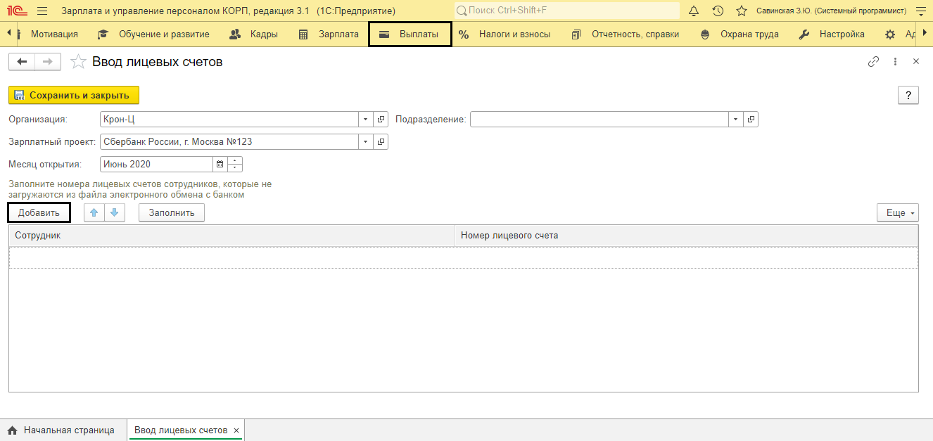 Для указания лицевого счета можно воспользоваться самой карточкой либо перейти к вкладке «Выплаты-Ввод лицевых счетов».
