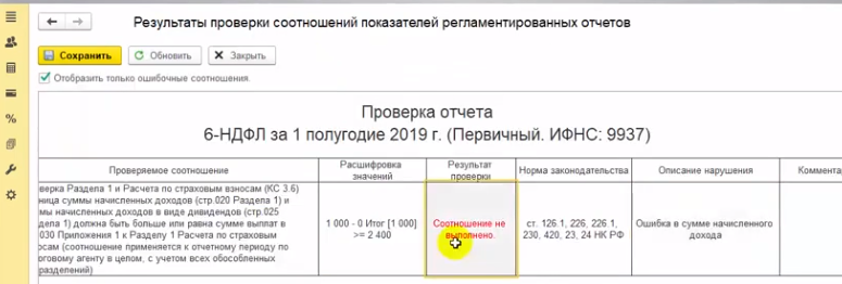 При проверке контрольных соотношений, программа сообщает о том, что соотношение не выполнено, и сумма начисленных сотруднику выплат превышает доход.