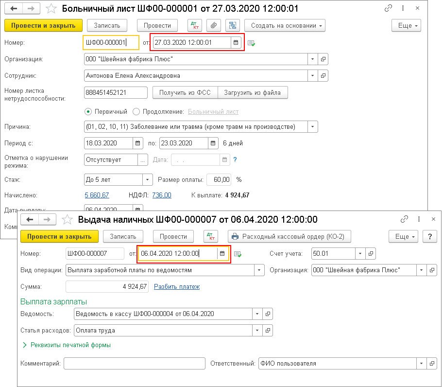 День удержания налога - дата выплаты дохода. В 1С день фактического получения дохода изначально указывается в разделе Больничный лист. Далее дата уточняется в автоматическом порядке (это происходит при оформлении документов на выплату). Так сделано из-за случаев, в которых фактическое число выплаты начислений различается с запланированной до этого в документе датой для того чтобы пользователю не нужно было возвращаться в документ начисления и уточнять день выплаты. Иными словами, настоящая дата фактического получения дохода (дата для строки 100) является числом документа на выплату (рис. 1).