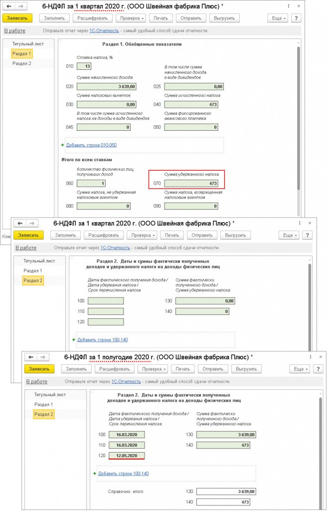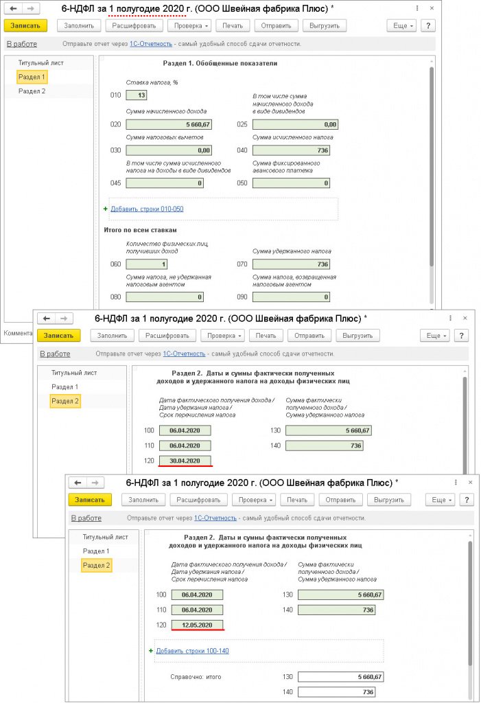 Если предприятие не вело деятельность во время нерабочего периода, сумма пособия будет отображена в разделе 1 и в разделе 2 подсчета за полугодие настоящего года. Однако период перечисления НДФЛ с суммы пособия - 12 мая (рис. 2).