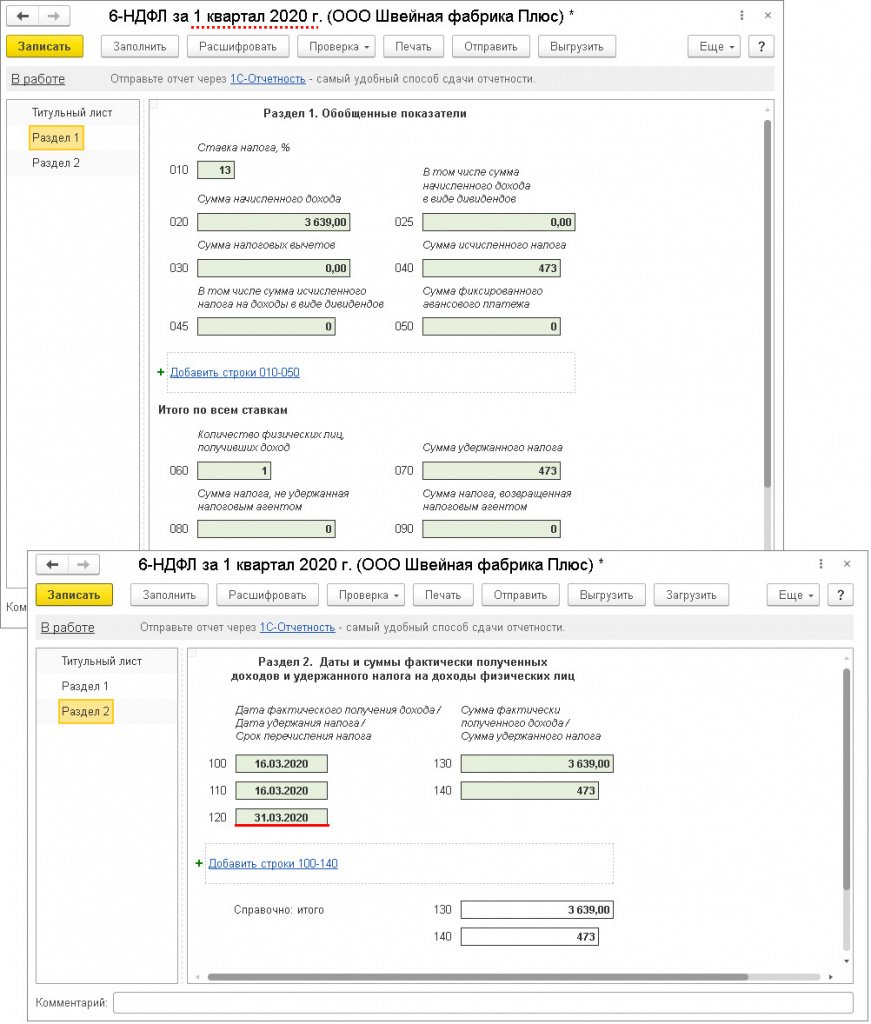 Если предприятие функционировало во время нерабочих дат, сумма пособия будет отображена в разделе 1 и в разделе 2 подсчета за 1 квартал настоящего года (рис. 3). Период перечисления НДФЛ с суммы пособия - 31 марта.