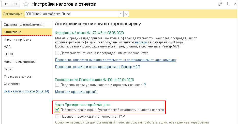 В программе для предприятий, действующих во время нерабочих дней, при установлении последнего срока уплаты налога получится не учитывать нерабочие даты. Для этого в настройке налогов и отчетов должен быть снят флаг Перенести сроки сдачи бухгалтерской отчетности и уплаты налогов (вкладка Главное-Налоги и отчеты-раздел Антикризис) (рис. 5).