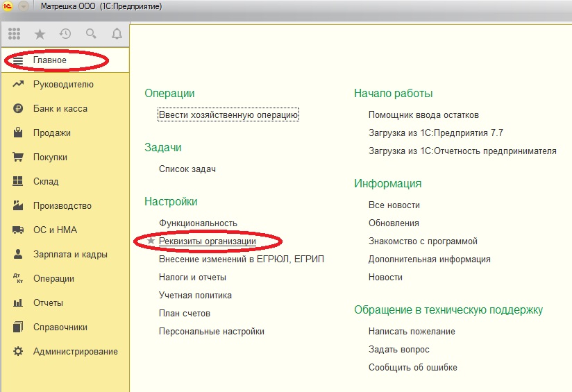 - Посетите подраздел «Реквизиты организации», расположенный в меню «Главное».