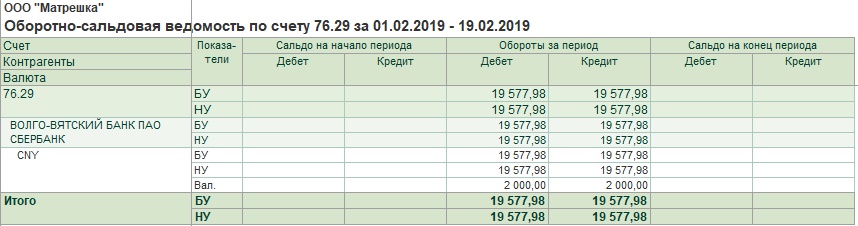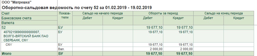 Обращаем внимание на строку «Переоценка валютных остатков». Утилита определила, какая сумма значилась по состоянию на прежнюю отчетную дату. В нашем случае, прежнее движение зарубежных финансов проводилось 18 февраля 2019 года, когда курс составлял 98,38 за десять юаней, то есть 2 000 юаней разделить на 10 (кратность) и умножить на 98,38 (по курсу), получим 19 677,10 рублей.