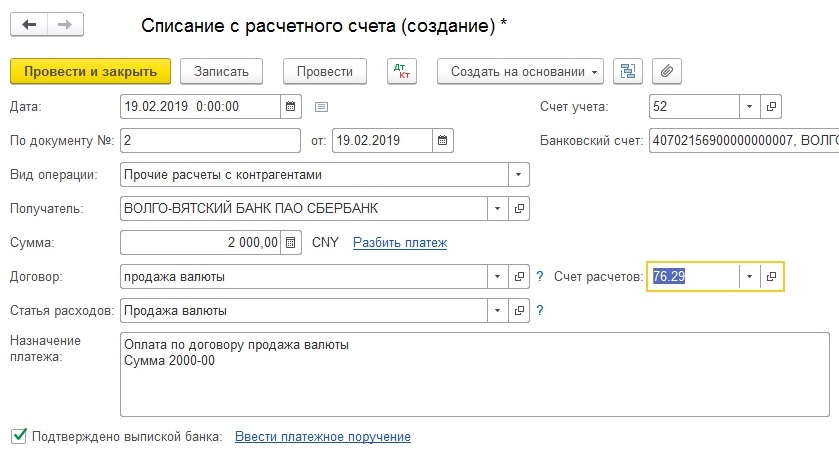 - Расчетный счет указываем следующий - «76.29 - Иные расчеты с различными дебиторами и кредиторами (в иностранной валюте)».
