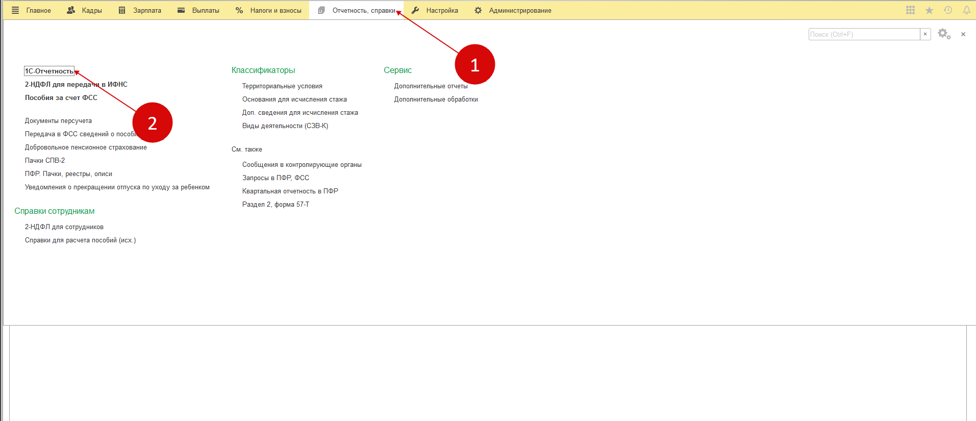 Для заполнения расчета 4-ФСС за 3 квартал в 1С: ЗУП нужно зайти во вкладку "Отчетность, справки", а затем нажать на гиперссылку "1С-Отчетность".