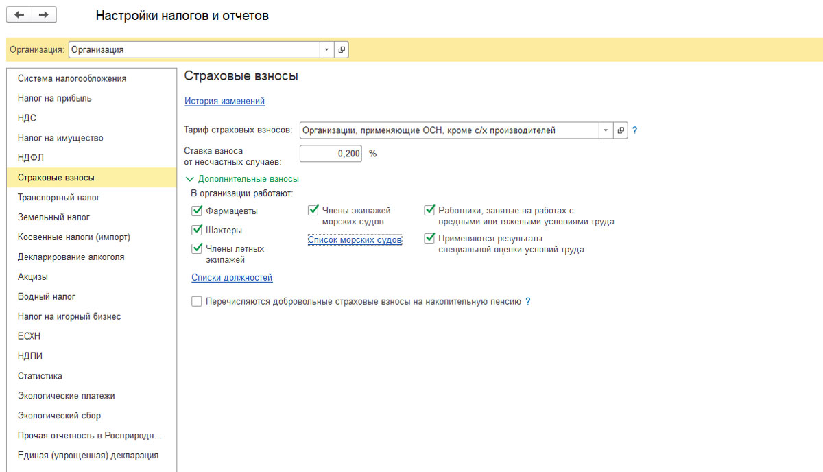 При работе с «1С:Бухгалтерия» нужная настройка происходит в диалоге «Настройки налогов и отчетов», в закладке «Страховые взносы».