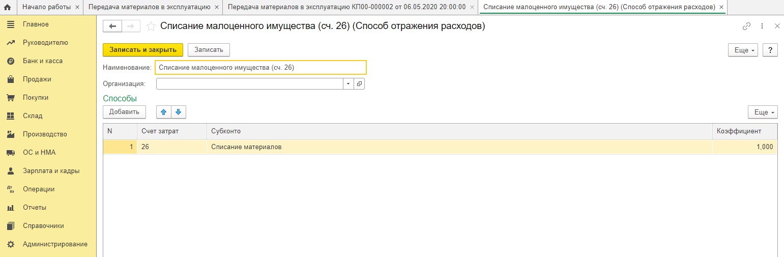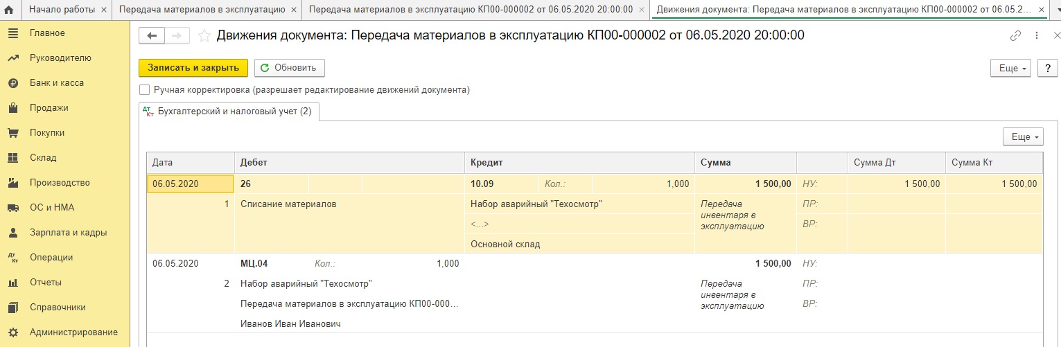 При проведении документ оформит проводки: Дт 26 Кт 10.09, а также отразит этот инвентарь на вспомогательном счёте МЦ.04, чтобы затем получилось сделать пересчет инвентаря в компании.