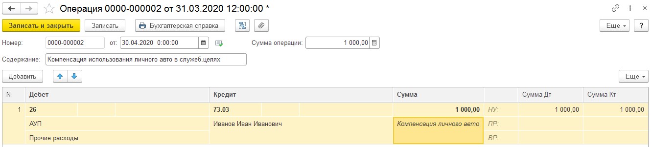 При применении личной машины в служебных целях, начисление компенсации вносится в категории «Операции» - «Операции, введённые вручную».