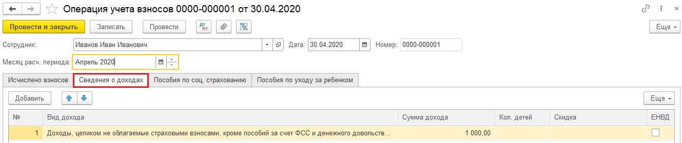 Сформируем новый документ. В нем в разделе «Сведения о доходах» добавим строчку и укажем сумму перечисленной компенсации.