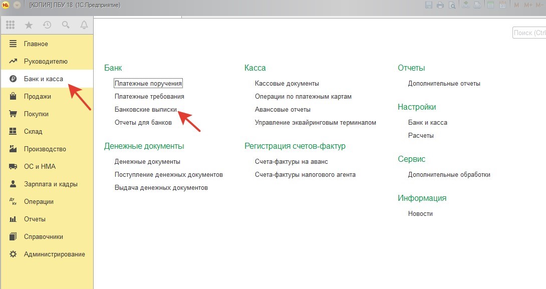 После этого нужно загрузить выписки в программу 1С: Бухгалтерия. Процесс можно автоматизировать. Для этого необходимо открыть «Банк и касса», что находится на панели разделов и выбрать подпункт «Банковские выписки».