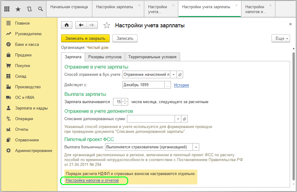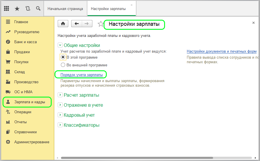 Кликаем по вкладке «Зарплаты и кадры», заходим в «Справочники и настройки», затем выбираем пункт «Настройки зарплаты», потом «Порядок учёта зарплаты».