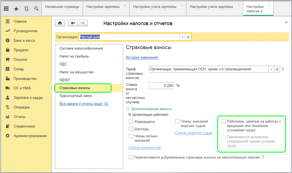 Заходим в «Страховые взносы». В правом нижнем углу располагаются пункты «Работники, занятые на работах с вредными и тяжёлыми условиями труда» и «Применяются результаты специальной оценки условий труда». Напротив этих пунктов ставим галочки.