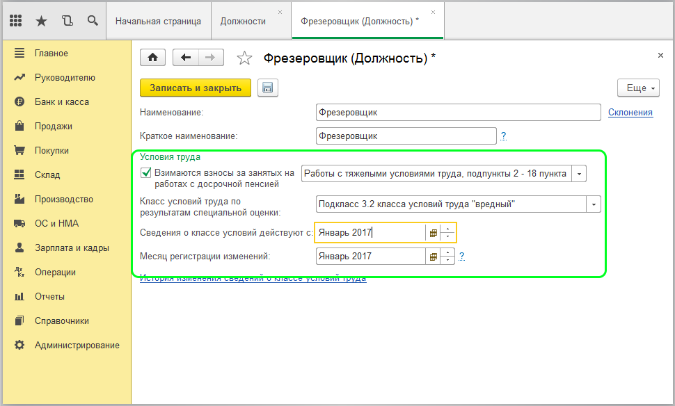 После всех настроек, в разделе «Должности» появится возможность указать вредные условия труда.