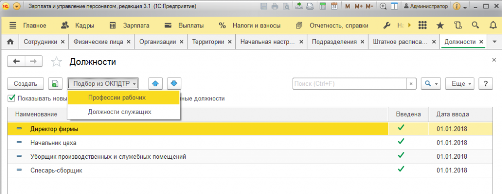 Правильней будет вносить должности посредством нажатия вкладки «Подбор из ОКПДТР», выбирая их из имеющегося списка должностей.