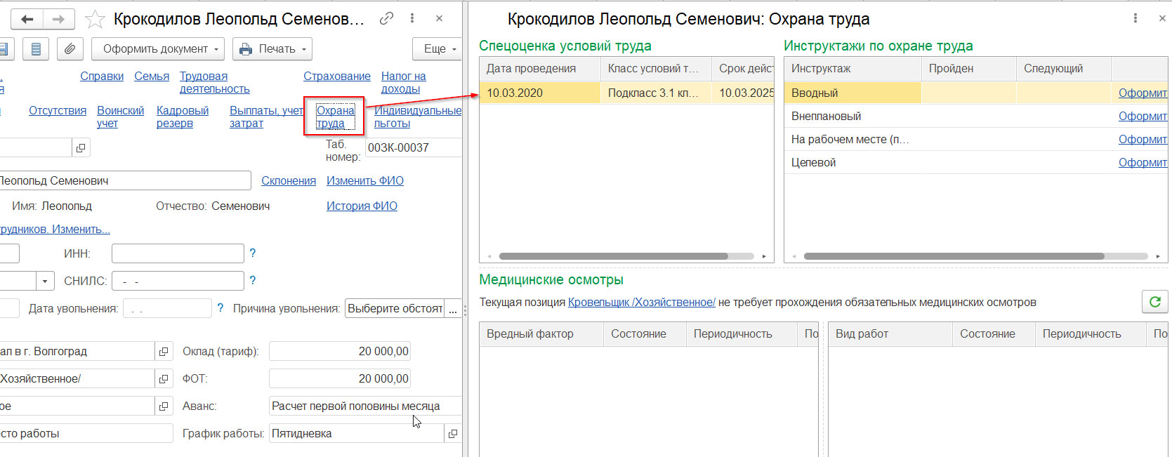 Дополнительно эти данные отражаются в специальной карточке сотрудника, в подразделе "Охрана труда".
