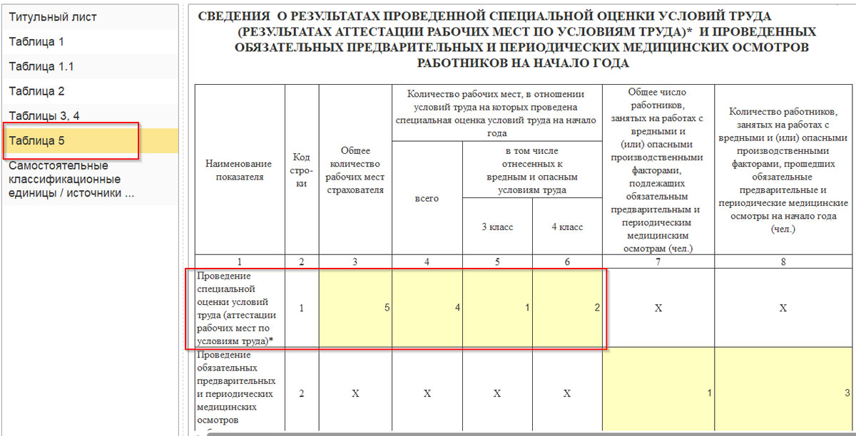 В графу три необходимо внести количество рабочих мест, по которым нужно совершить аттестацию. Четвертая графа отразит число мест уже прошедших СОУТ. Графы пять и шесть требуют внесения информации о числе мест, которые отнесены к вредным. В случае, если СОУТ не проходил, графы четыре, пять и шесть остаются "Нулевыми" (ставится "0").