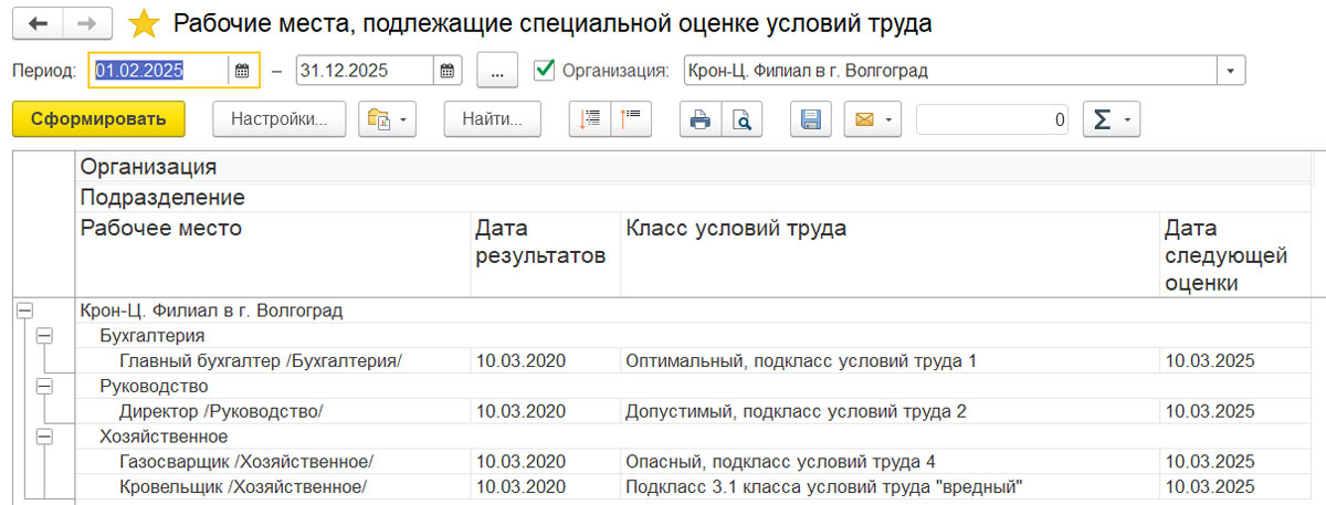 Контролировать сроки проведения СОУТ можно по отчетам о рабочих местах. В рассматриваемом примере проверка была проведена в марте 2020 года (10 числа). В соответствии с законом, в следующий раз ее нужно начинать ровно через пять лет - десятого марта 2020 года. Именно такая информация и находится в отчете.