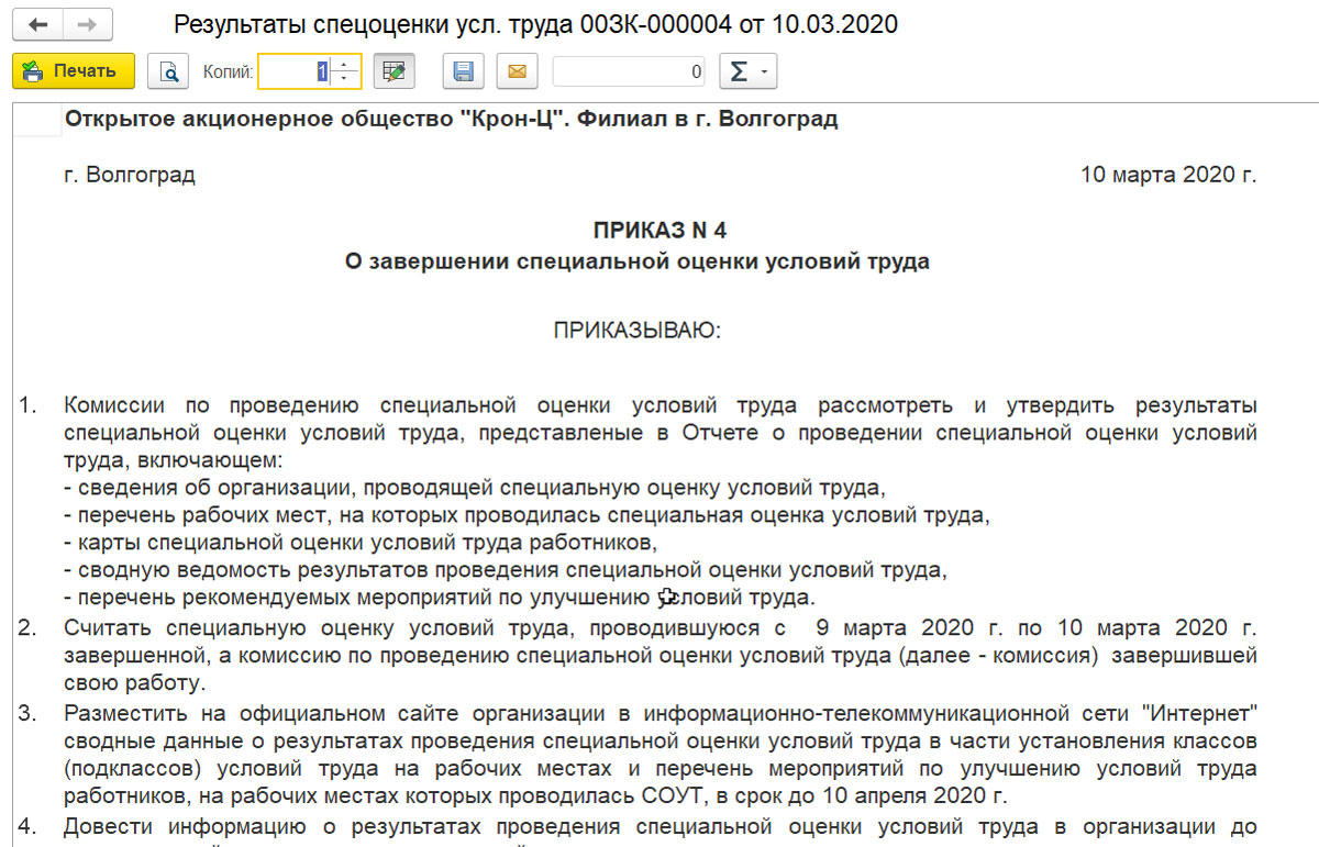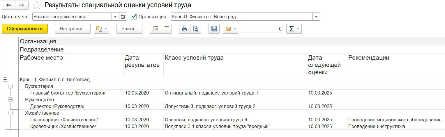 Его формирование происходит на базе документа подготовки. В нем находят отражение результаты оценки рабочих мест. Появится информация о всех классах условий труда. Предусмотрена опция добавления рекомендаций.