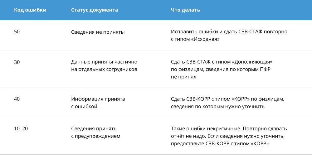 Как исправить сведения в форме СЗВ-стаж в зависимости от кода ошибки в протоколе: