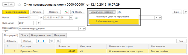 В качестве примера рассмотрим процесс создания «Требование-накладной» на основании «Отчёта производства за смену».