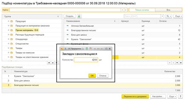 Если во вкладке «Настройка» стоит галочка в графе «Запрашивать количество», то при выборе номенклатуры отобразится диалоговое окно, в котором указывается число единиц для добавления в документ. Затем, благодаря команде «Перенести в документ», они оказываются в табличной части.