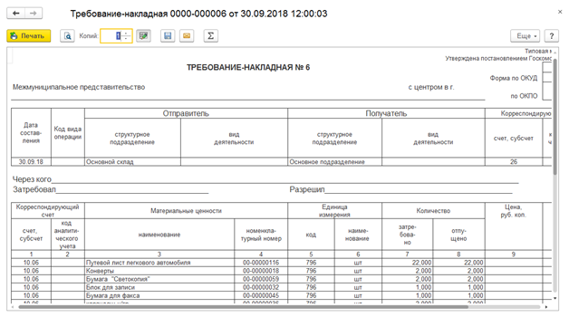 При нажатии на кнопку «Печать» из документа можно сделать распечатку форм «Требование-накладная» и «Требование-накладная (М-11)».