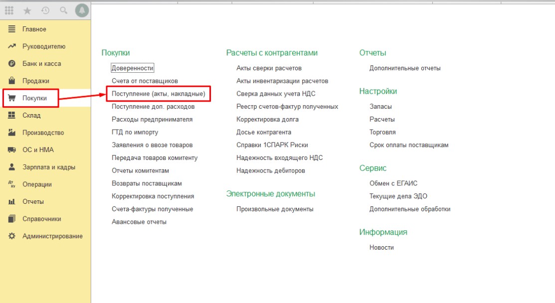 Каждый месяц лизингодатель станет выставляться счет фактуру за услуги лизинга. Для контроля услуг в программе 1С: Бухгалтерия Предприятия 8.3 имеется вкладка «Покупки» и подраздел «Поступление (акты, накладные).