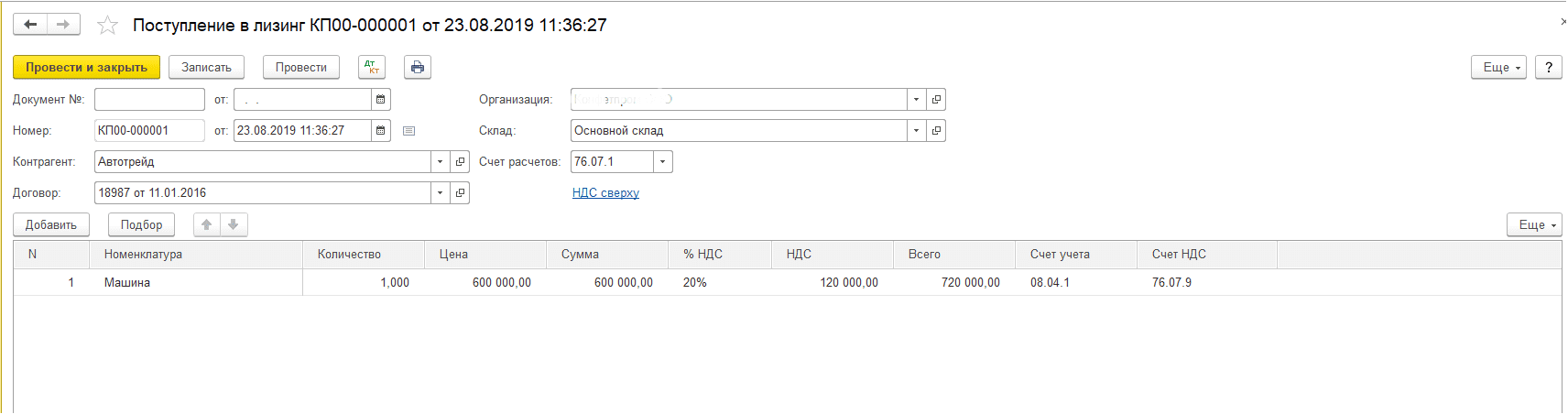 Необходимо учитывать, что счет учета будет 76.07.1. В таблицу учета следует занести сведения о покупаемых объектах лизинга. Вводим счет учета «Приобретение ОС» 08.04.2 (не работает на счете 08.04.2 релиза 3.0.66.60).