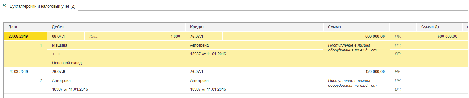 После указания всей информации по приходу, кликаем на «Провести». После этого данные о затратах на услуги лизинга появятся в НУ и БУ. Кликаем на ДтКт и сверяем проводки.