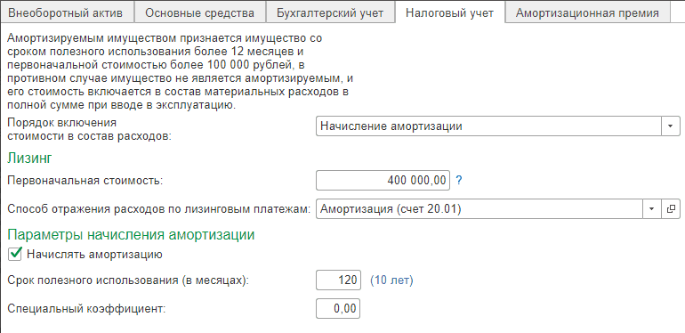 - Срок полезного использования – здесь заносится информация о том, на какой срок планируется амортизация лизингового оборудования. В нашем примере 120 мес. или 10 лет.