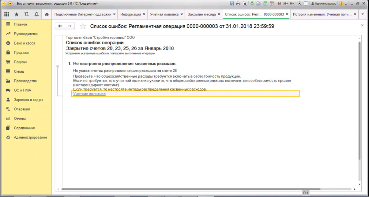 Если метод учета затрат неполно или неправильно отражен, системой 1С будет выдана информация, в которой будут указана конктеная ошибка, допущена в учетной политике, и выданы предложения по действиям, которые смогут устранить допущенную неточность.