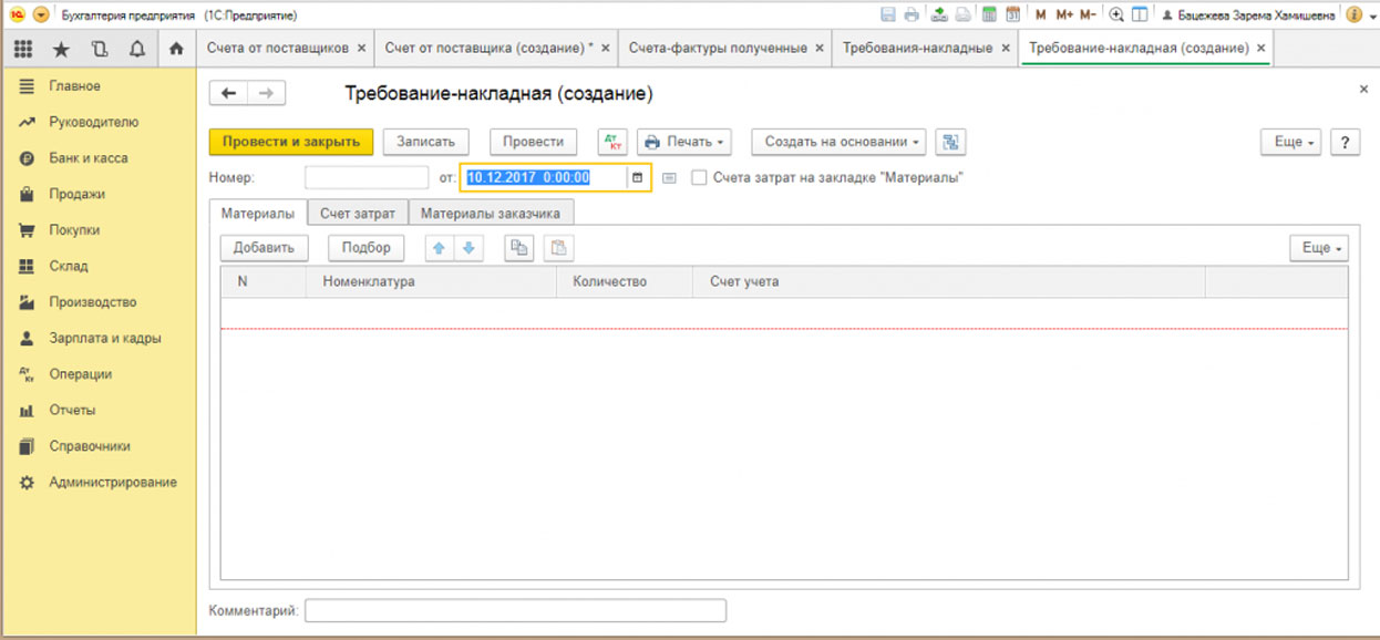 После того как необходимые для производства товары появились на складе, в 1С появляется возможность формировать электронные документы в формате «Требование-накладная». Необходимость в создании этого документа объясняется тем, что он позволяет списать для производства находящиеся на складе материалы. Для создания в меню «Производство» нажимается кнопка «Создать», после чего вносятся сведения по материал и его количеству и счету списания.