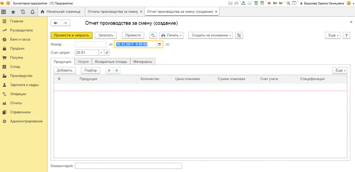 В соответствии с результатами работы смены создается соответствующий документ в меню «Производство». В нем должны отражаться результаты , выраженные в количестве единиц продукции (сумок), пошитых за одну смену.