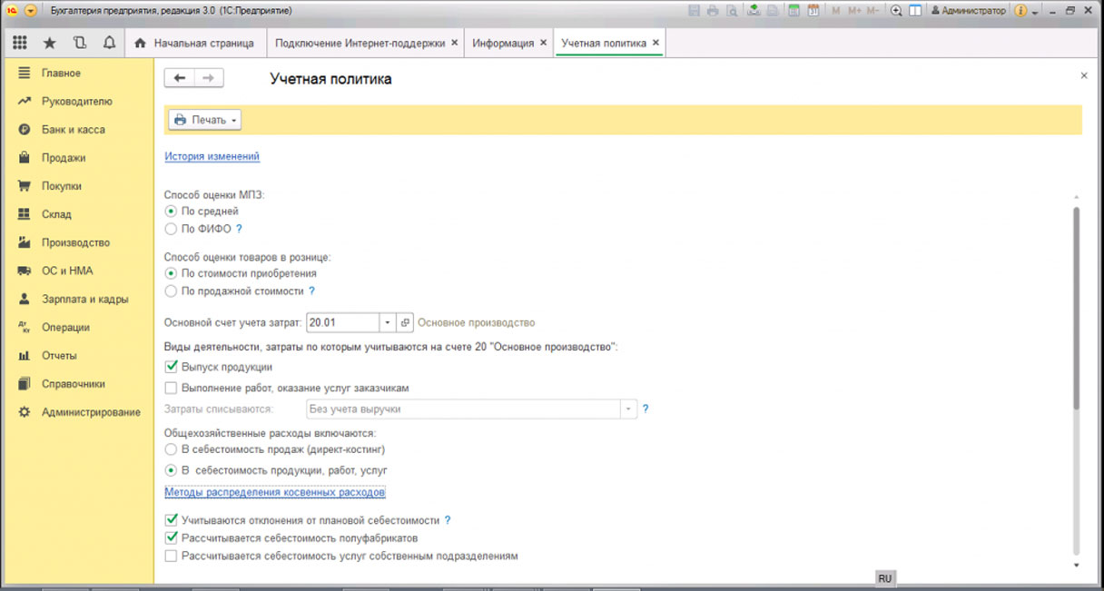 Чтобы корректно распределить косвенные расходы организации, бухгалтер должен отразить метод распределения затрат в графе «Учетная политика». Такое распределение обычно пропорционально или выплачиваемой заработной плате, или выпуску готовой продукции.