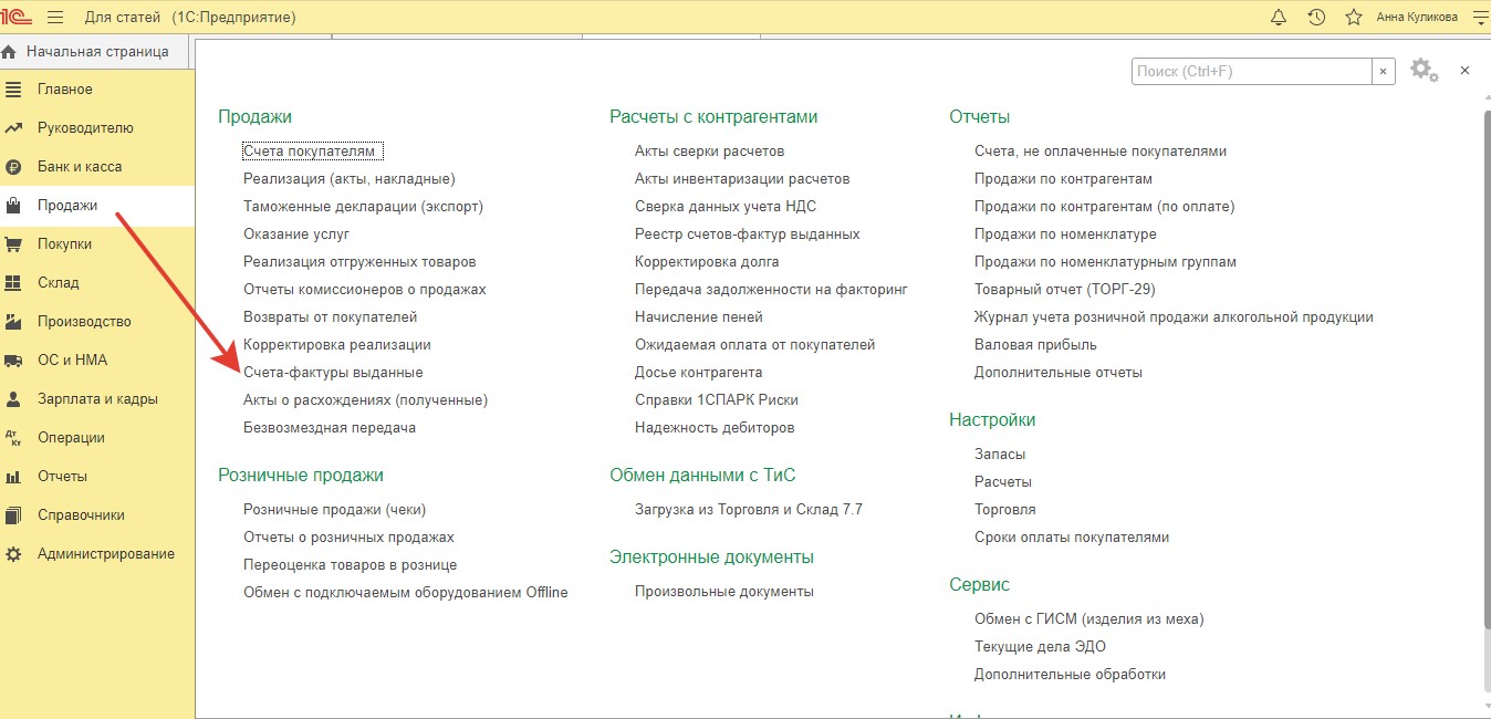 Операция реализации металлолома обязательно должна быть отражена в программе. Она оформляется следующим образом: составляется документ "Реализация товаров". Для этого нужно предварительно открыть раздел "Продажи".