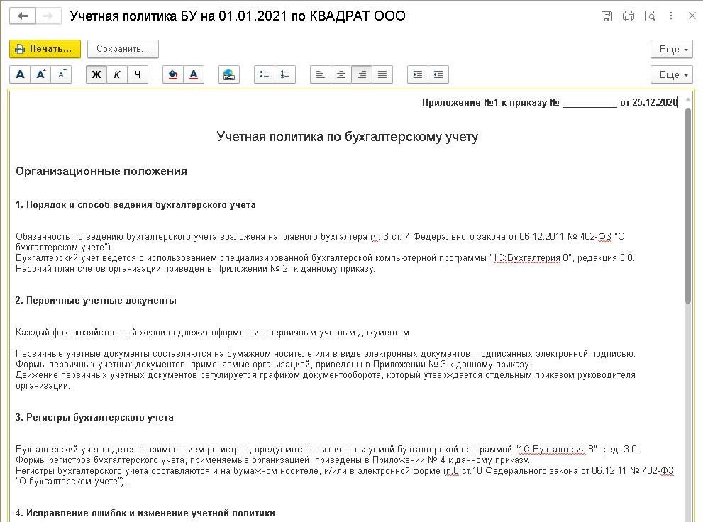 Нажав на кнопку «Сохранить», пользователь может сохранить измененные макеты учетной политики в файл в формате htm. Также можно сохранить и сам приказ.