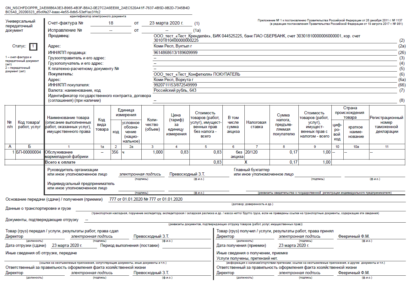Соответственно, статус УПД указывает на то, какие цели поставлены перед универсальными передаточными документами в системе документооборота. Если при формировании УПД второй статус присваивается ошибочно, однако все требующиеся для СФ графы оформлены должным образом, применять универсальный передаточный документ для подачи на вычет разрешено.  Конец формы